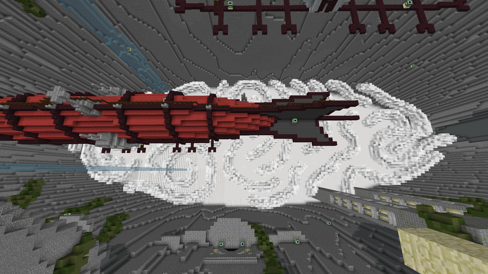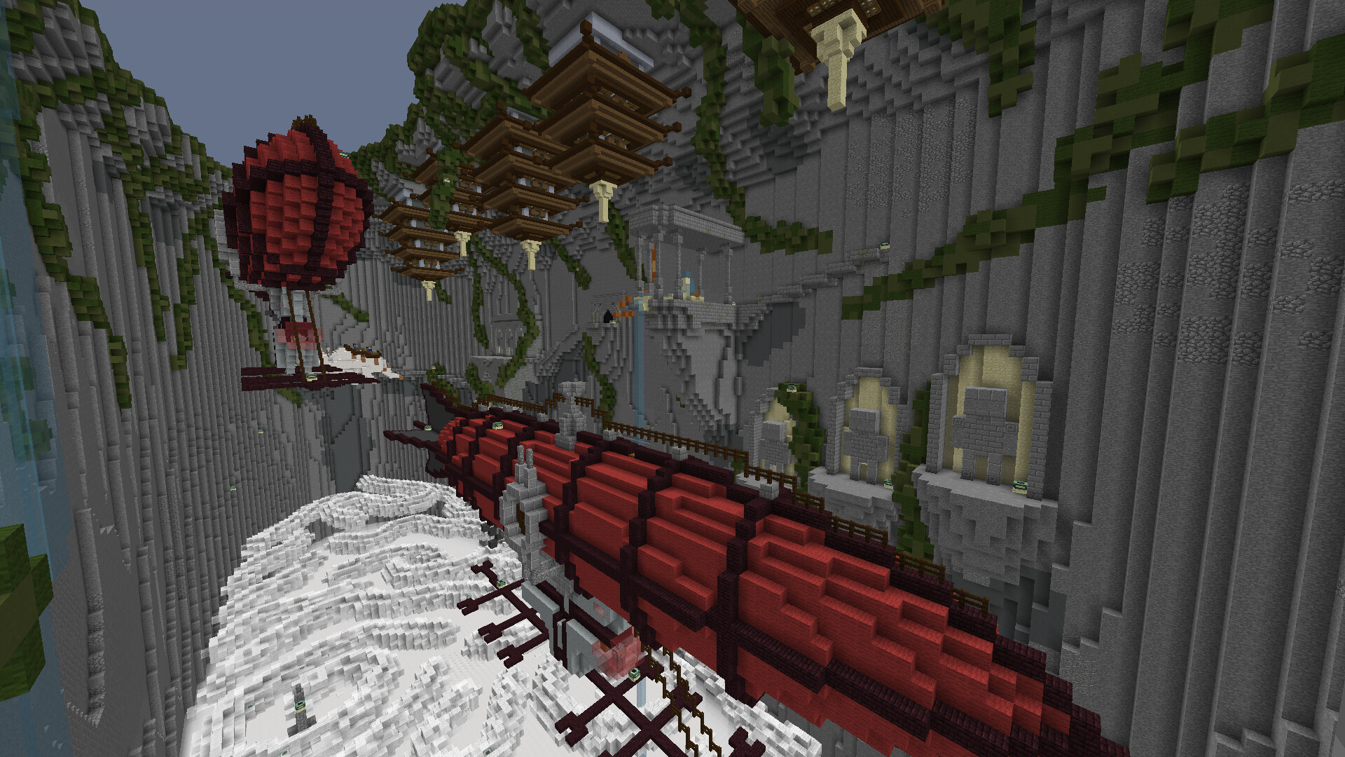 The colouring is really rough on this one so I see your point. I tried multiple things to break up the greyness but couldnt get a nice mix of colours on it so I decided to just have multiple shades of grey in there. For example: stone, cobble, andesite and even the clay. So what I decided to do instead was contrast the gray with brighter colors such as the vines the red airships and I tried to do the same aswell with the sandstone to just draw your attention towards instead of the big grey walls.
